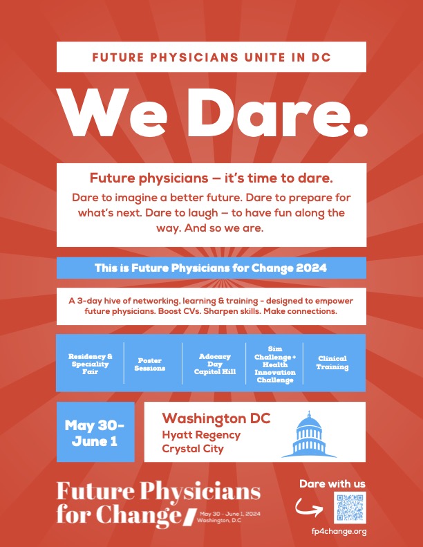 It is up to us — the next generation of physicians — to achieve equity and justice in healthcare. To dare to imagine a better future. To take what’s in front of us, put a match to it and drive impact. And this is how we do it. Join us for Future Physicians for Change 2024 on May 30 – June 1 in Washington DC.